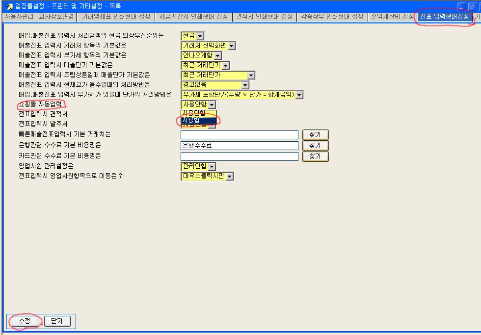 | ¢Ñ 'ÀüÇ¥ÀÔ·ÂÇüż³Á¤' - '¼îÇθô ÀÚµ¿ÀÔ·Â' Ç׸ñÀ» '»ç¿ëÇÔ' À¸·Î º¯°æÈÄ '¼öÁ¤' À» Ŭ¸¯ ÇÕ´Ï´Ù. |